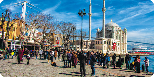One of Istanbul’s most popular landmarks, Ortaköy Square is located on the Bosphorus shoreline, near the foot of the Bosphorus Bridge. The Büyük Mecidiye Mosque and the Esma Sultan Mansion are in the area, as are numerous seaside cafes and street food vendors.