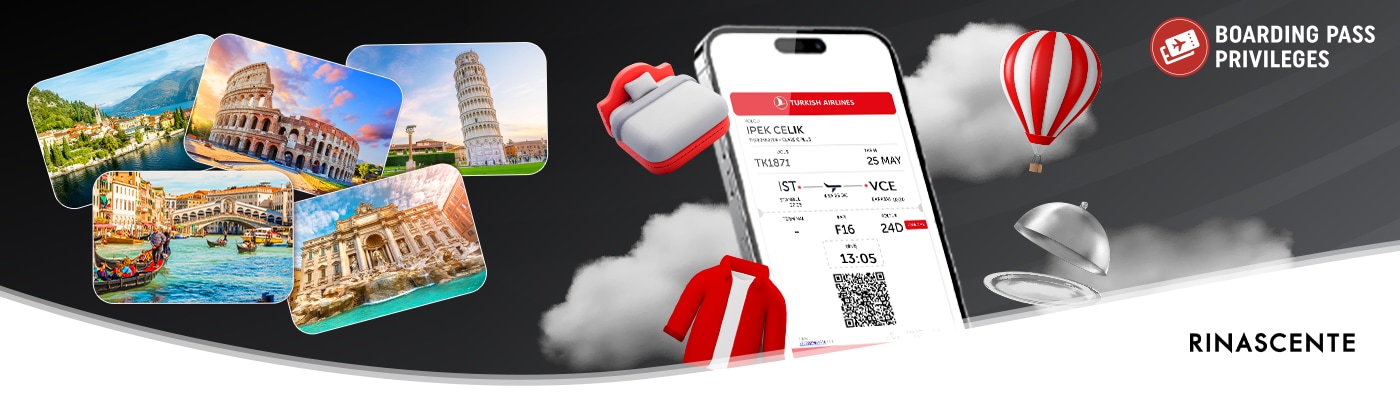 Turkish Airlines passengers can enjoy special benefits with Rinascente, Italy's luxury store chain, via our collaboration with Rinascente branches in Milan (Duomo), Rome Via del Tritone, Rome Fiume, Florence, Palermo, Cagliari, Turin, Monza and Catania. Personal shopping consultant services, a 10% discount, priority line for tax refund (available only at Milan-Duomo and Rome Via del Tritone), complimentary drinks for Business Class passengers (not available in Catania), and complimentary delivery to your hotel are waiting for you. This campaign is valid until December 31, 2025.