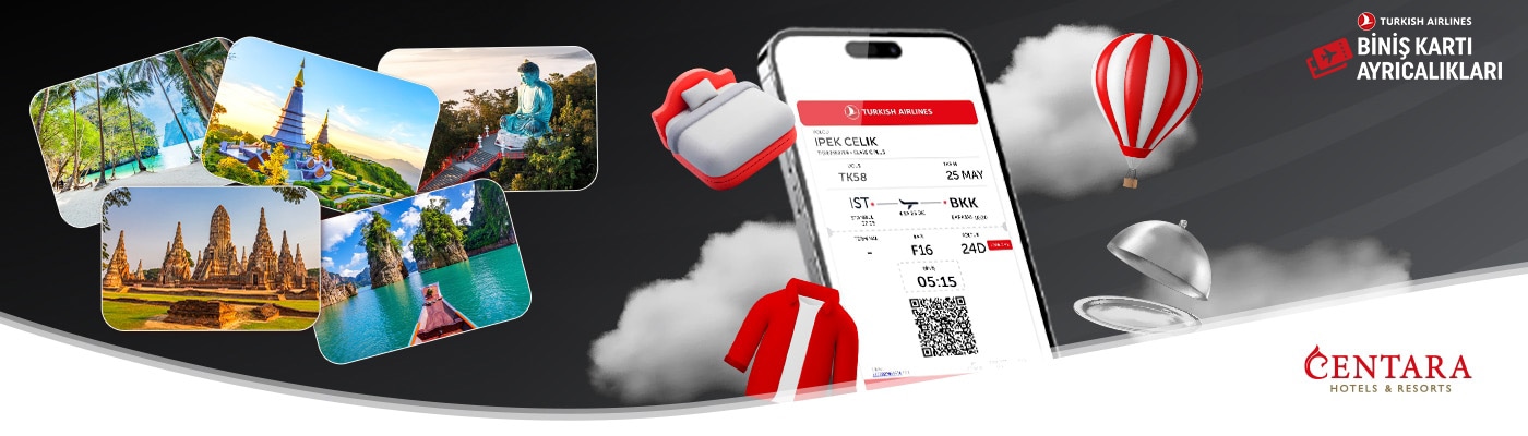 Tayland’da biniş kartı ayrıcalıkları ile seyahatinize keyif katın. Kültürel mirası, masmavi plajları ve özgün mutfağının yanı sıra Tayland sizi Türk Hava Yolları biniş kartına özel fırsatlarla ağırlıyor. Restoranlardan alışveriş noktalarına, otellerden eğlence mekanlarına pek çok anlaşmalı markada geçerli avantajların tadını çıkarın.
