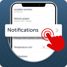 Yoğun bir uçuş programınız varsa akıllı uygulamamız hayatınızı çok kolaylaştıracak. Anlık bildirimler ile uçuşunuz ile ilgili tüm detaylara hemen ulaşabilirsiniz. Telefonunuzun ayarlar kısmından uygulamamız için bildirimlere izin verdikten sonra, anlık bildirimleri açmak için: