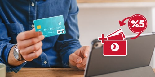 Uçak bileti ve ek hizmet alırken TK Cüzdan’a para yükleyip ödemesini TROY kartla yaptığınız uçuşlarda %5 oranında TK Para kazanma avantajı sizi bekliyor. 20 Kasım 2024-20 Mart 2026 tarihli seyahatleriniz için 20 Kasım 2024-31 Mart 2025 tarihleri arasında bilet alarak bu ayrıcalıktan yararlanabilirsiniz.